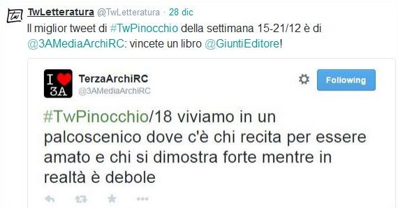 “Viviamo in un palcoscenico dove c’è chi recita per essere amato e chi si dimostra forte mentre in realtà è debole”: è della terza A Klearchos, plesso dell’Istituto Comprensivo Falcomatà-Archi di Reggio Calabria, il miglior tweet della settimana 15-21 dicembre su Le avventure di Pinocchio, il capolavoro di Carlo Collodi che 53 scuole in tutta Italia stanno riscrivendo insieme a TwLetteratura, comunità di lettori nata per commentare e interpretare i testi della letteratura italiana attraverso i social network.