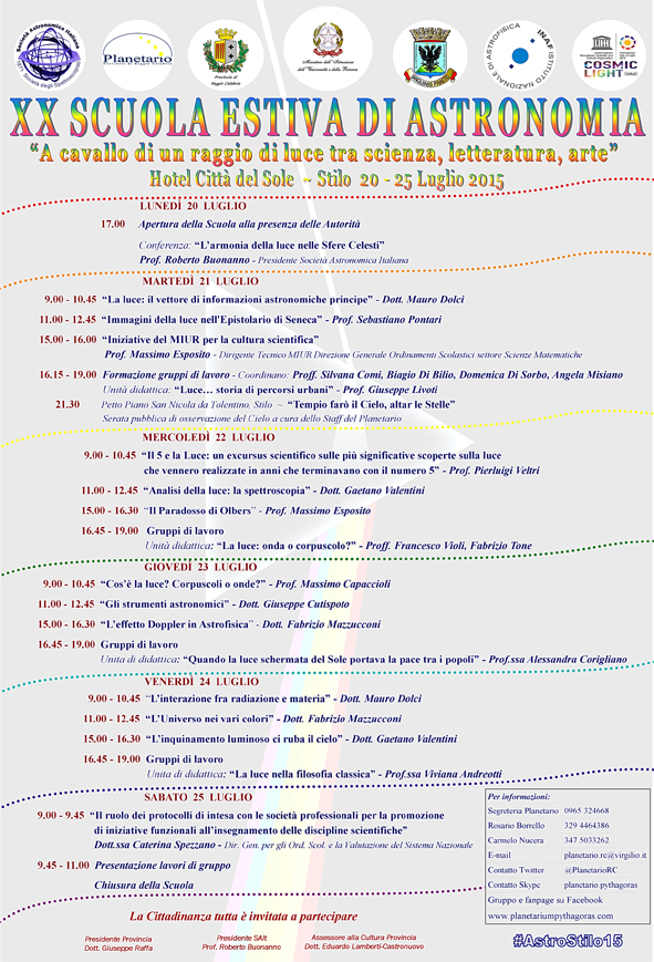 La Società Astronomica Italiana, che ha il privilegio di collaborare, attraverso vari protocolli di intesa, con la Provincia di Reggio Calabria fin dal 1994 e che, attraverso un’articolata convezione, dal 2004 ha la responsabilità scientifica del Planetario provinciale Pythagoras, assieme all’Ente Provincia, alla Direzione Generale per gli Ordinamenti Scolastici e la Valutazione del Sistema Nazionale di Istruzione del Ministero dell’Istruzione, dell’Università e della Ricerca, all’Istituto Nazionale di Astrofisica ed al Comune di Stilo, organizza la XX edizione della Scuola Estiva di Astronomia di Stilo.