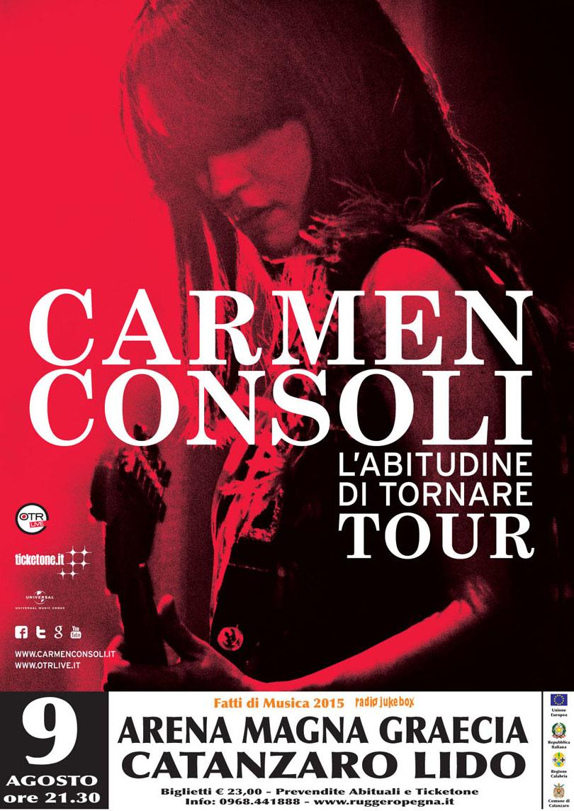 […] Dopo il successo di Caparezza a Reggio Calabria e dei Sud Sound System a Palmi, la prestigiosa rassegna arriva domani a Catanzaro con il concerto di Carmen Consoli all’Arena Magna Grecia, unico appuntamento dell’ artista siciliana in Calabria. Inizio alle ore 21.30. Biglietti disponibili al prezzo di € 23 nei punti prevendita e dalle ore 18 presso la biglietteria dell’Arena. Nella ristrutturata Arena di Catanzaro, il palcoscenico è già pronto. La Consoli ci salirà insieme a Luciana Luccini al basso e Fiamma Cardani alla batteria. Prima del concerto, apertura con Manuel Foresta, talento della prima edizione di “The Voice”. […]