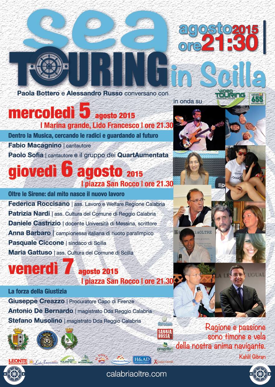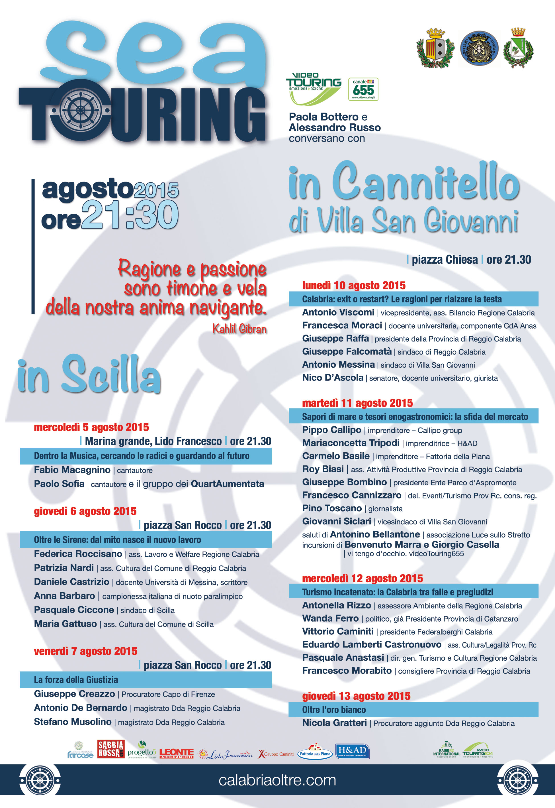 La rassegna proseguirà in altre location mozzafiato, tra il cielo e il mare, sempre con inizio alle 21 e 30: il 6 e il 7 agosto a Piazza San Rocco a Scilla, il 10, 11, 12 e 13 agosto a Piazza Chiesa di Cannitello, sul lungomare affacciato nel punto più suggestivo dello Stretto. Giornalisti, musicisti, magistrati, intellettuali, imprenditori, manager pubblici, amministratori regionali, provinciali e comunali, uomini e donne che rappresentano le eccellenze della Calabria si confronteranno a viso aperto nei luoghi dov’è nato il mito e che profumano della nostra storia.SeaTouring è un evento che nasce per iniziativa del network Touring (Video Touring canale 655 dgtv – Radio Touring 104) e della casa editrice sabbiarossa ED, mettendo in rete amministrazioni pubbliche, associazioni e eccellenze imprenditoriali.