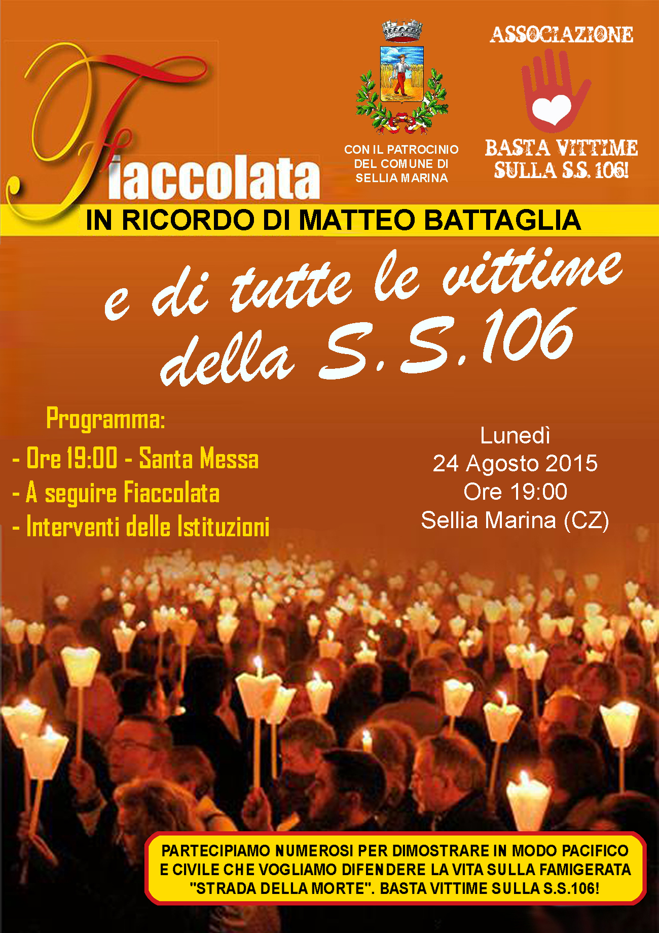 L’Associazione “Basta Vittime Sulla Strada Statale 106” con il patrocinio dell’Amministrazione comunale di Sellia Marina ha organizzato il prossimo 24 agosto una Fiaccolata in ricordo del piccolo Matteo Battaglia e di tutte le vittime della S.S.106 in Calabria. L’iniziativa avrà luogo a Sellia Marina a partire dalle ore 19:00 nella Chiesa Stella Maris a due anni esatti dalla scomparsa di Matteo. Inizierà, presieduta dai Parroci Don Raffale e Don Giuseppe, la Santa Messa. A seguire avrà luogo la fiaccolata che terminerà con gli interventi istituzionali previsti.