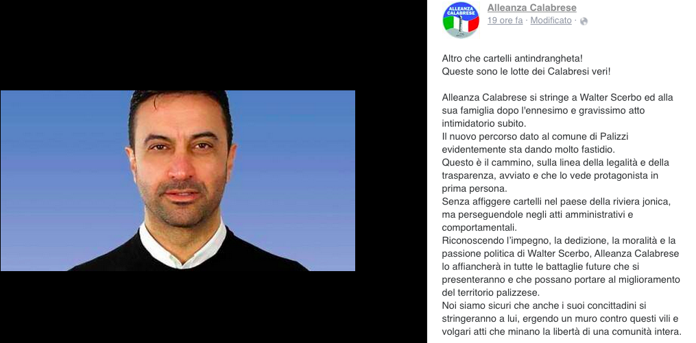 Esprimo piena solidarietà nei confronti del collega sindaco di Palizzi Walter Scerbo.