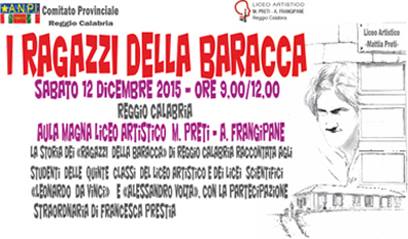 Al centro del programma l’esibizione straordinaria di Francesca Prestia, cantastorie calabrese, che eseguirà, insieme ad altri due brani fortemente correlati ai contenuti delle vicende raccontate, una canzone inedita dedicata ai “ragazzi della baracca” di Reggio Calabria. L’iniziativa dell’A.N.P.I. rivolta agli studenti delle quinte classi è programmata per le ore 9.00 di sabato 12 dicembre 2015 nell’Aula Magna del Liceo Artistico “Mattia Preti”.