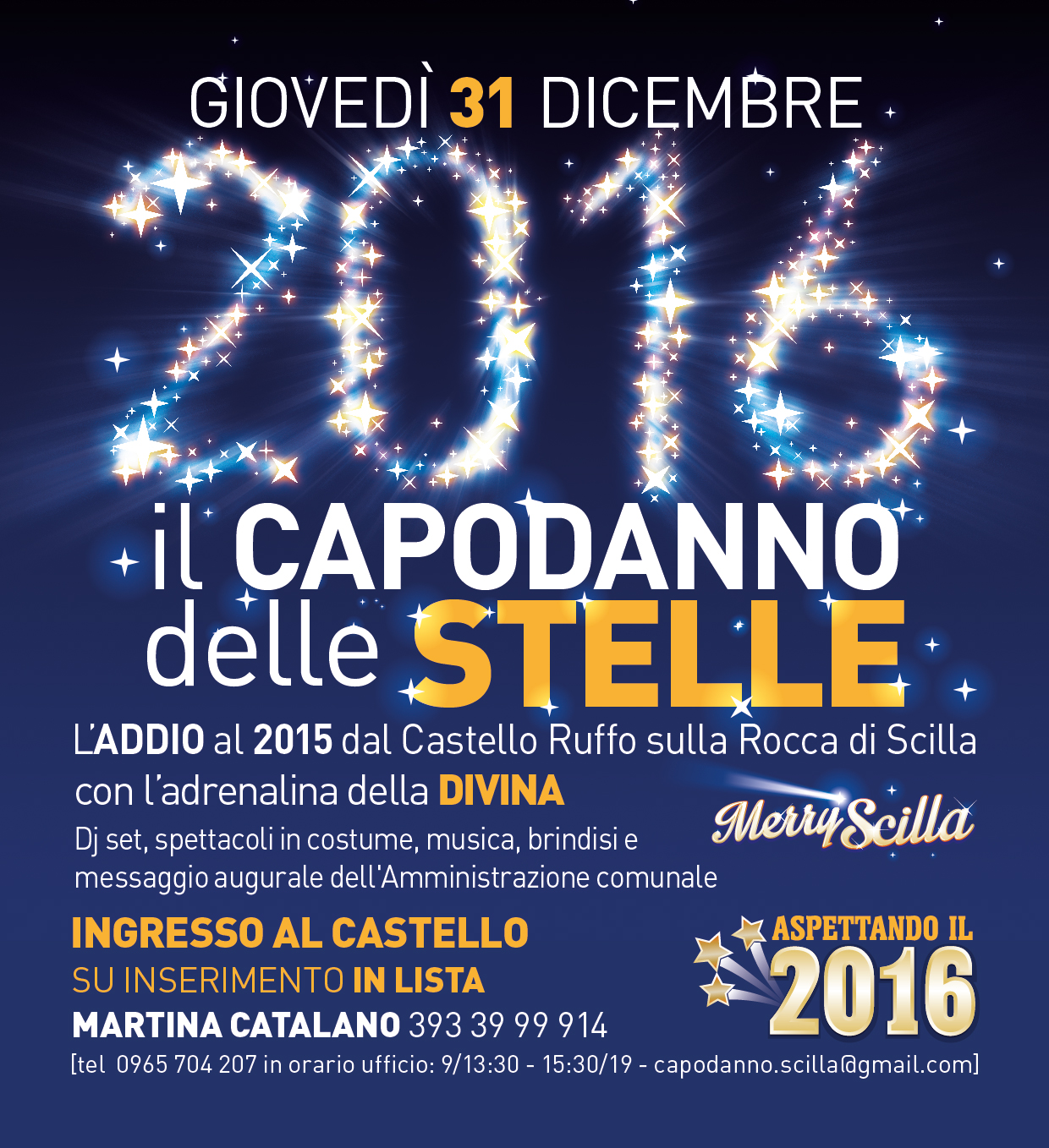 Infine giovedì 31, la notte di San Silvestro al Castello Ruffo, una notte delle stelle da vivere in un luogo magico per dare l’addio al 2015. Ricchissimo il programma: spettacoli in costume, musica, il dj set con l’adrenalina della Divina supportata da Antonio Scambia e Saverio Canale, che suonerà dal vivo con un Akai elettronico, brindisi e messaggio augurale del sindaco Pasqualino Ciccone e di tutta l’amministrazione comunale aspettando il 2016. Per l’ultima serata del 2015 l’ingresso al Castello, il cui costo è di 15 euro, sarà su inserimento in lista (tel 0965 704 207 in orario ufficio: 9:00/13:30 – 15:30/19:00 | capodanno.scilla@gmail.com).
