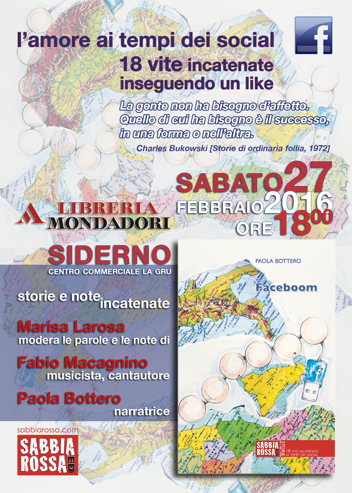 Il secondo a Siderno, alle 18, alla libreria Mondadori del Centro commerciale La Gru, dove la moderatrice Marisa Larosa metterà a confronto due mondi opposti: quello della vita in assenza di amore di Faceboom e quello di emozioni pure tradotte in musica di Fabio Macagnino. La rappresentazione della vita e le note colorate di chi canta la vita reale: incrociare due opposti per cercare di cancellare ciò che sta diventando una deriva sempre più evidente.