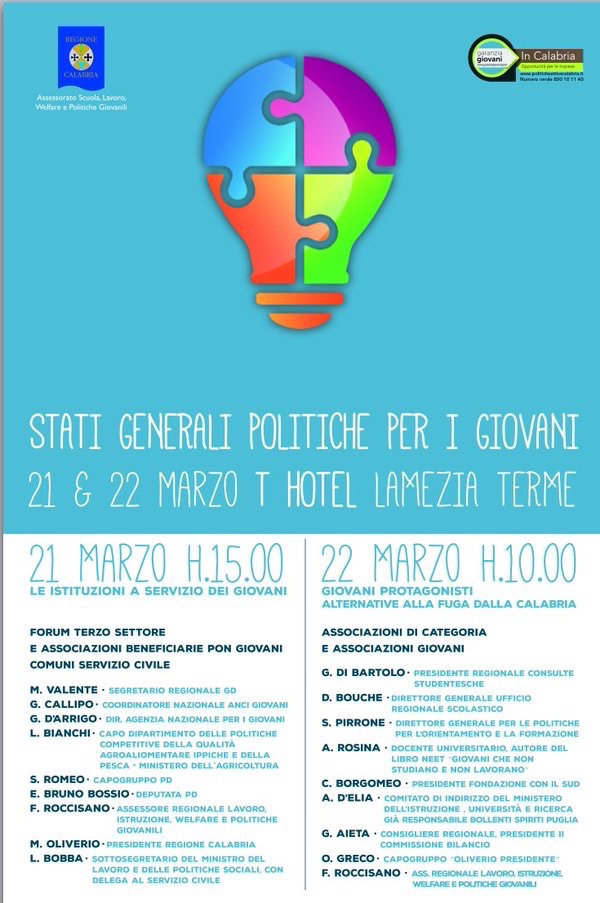 Con tutto il rispetto dovuto al lavoro dell’assessore Roccisano e pur confidando nelle sue buone intenzioni, non si può lasciare considerare il tutto come una semplice leggerezza organizzativa. Questi ‘stati generali’ sembrano piuttosto degli stati molto ‘particolari’, e sembrano avere il solo obiettivo di dare una importante tribuna istituzionale al Partito Democratico e al suo movimento giovanile, che avranno l’occasione di parlare ad una platea di giovani calabresi e rappresentanti del mondo associativo e studentesco utilizzando surrettiziamente il marchio istituzionale della Regione Calabria.
