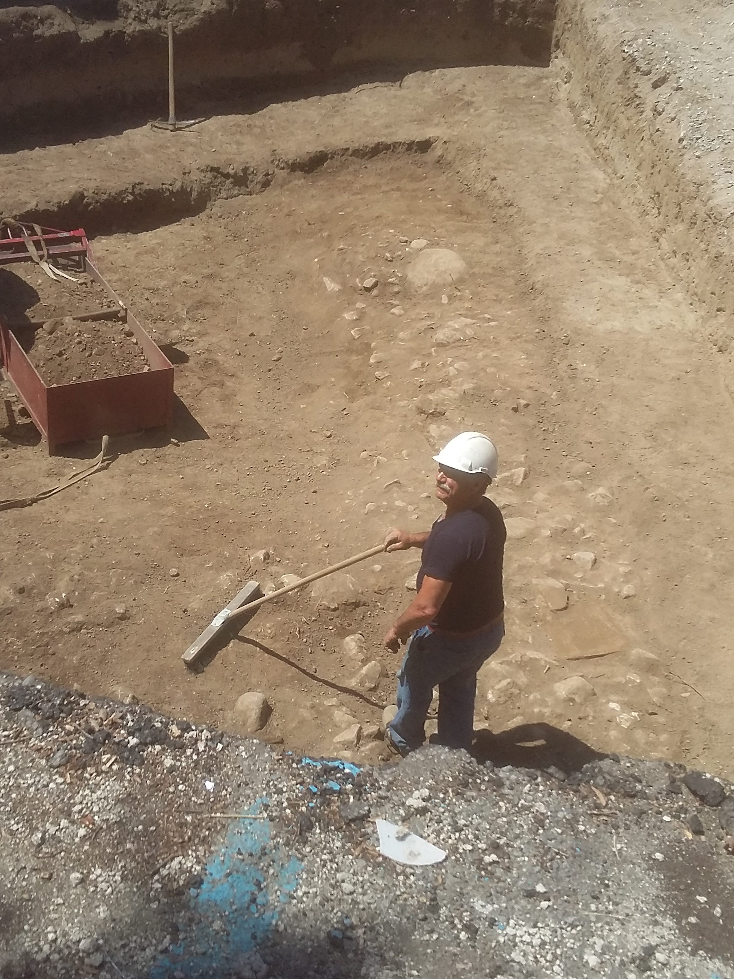 L’acciottolato si vede, dove sembra non ci sia muro l’escavatore prova a scendere. Una pietra grossa. Pietre di fiume, forse quel Calopinace-Apsias che ancora non si capisce dove scorresse, forse esondazioni marine.