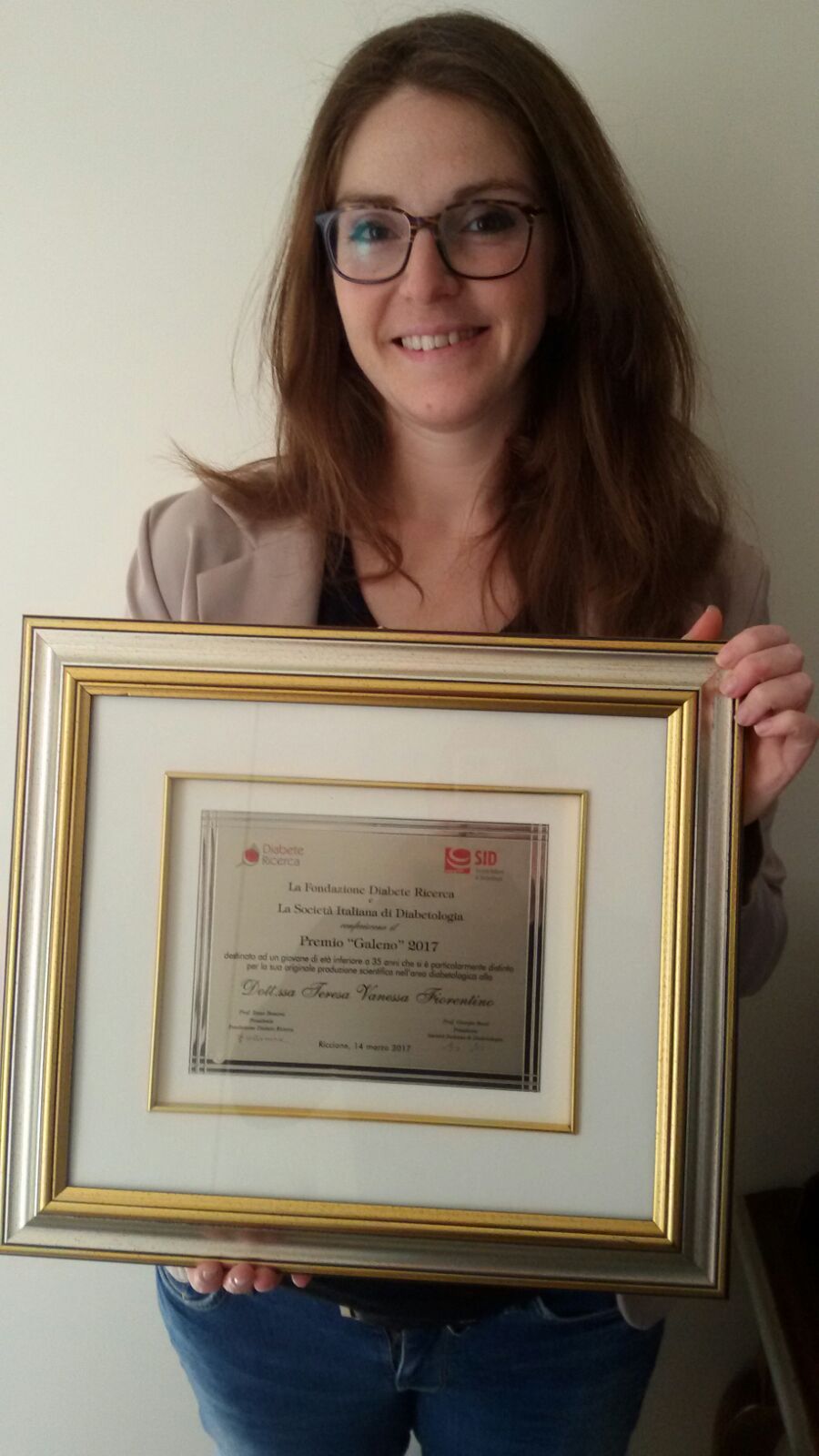È stato vinto dalla giovane ricercatrice catanzarese Teresa Vanessa Fiorentino il “Premio SID Galeno 2017” che le è stato conferito nel corso del Congresso “Panorama Diabete” che si è tenuto a Riccione nello scorso mese di marzo. La dottoressa Fiorentino è medico specialista in Medicina interna e ricercatrice iscritta al Dottorato di ricerca “Biomarcatori delle malattie croniche e complesse” dell’Università Magna Graecia, nell’équipe del prof. Giorgio Sesti.