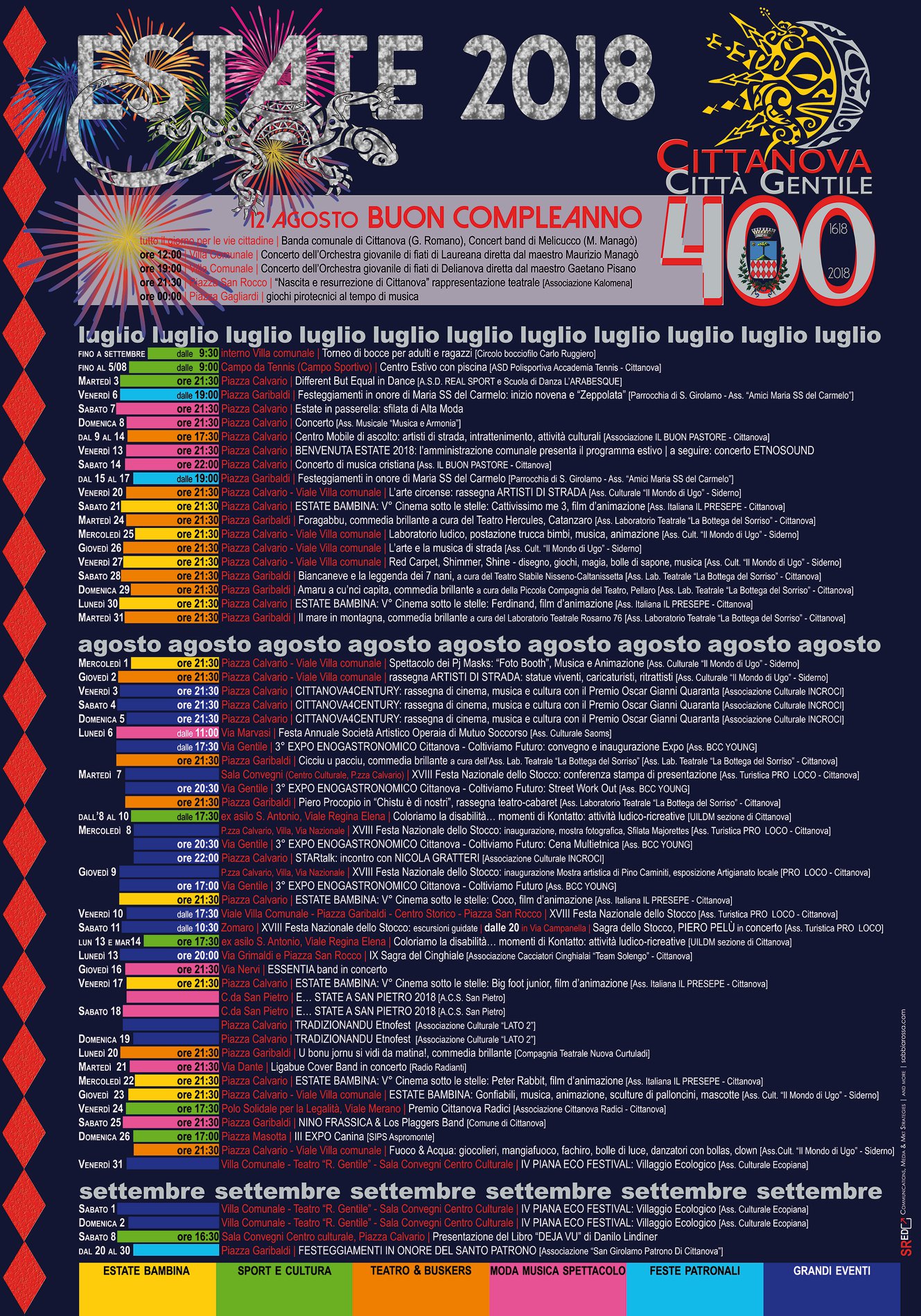 E ancora spazio a gruppi musicali, artisti di strada, rappresentazioni teatrali di commedie brillanti in piazza, cinema e giochi per bambini, danza e tantissimo sport in tutte le serate di luglio e agosto, fino ai festeggiamenti patronali di fine settembre. «Cittanova sarà al centro dell’estate e festeggerà degnamente i suoi 400 anni», ha concluso il Sindaco Cosentino. «Lo sforzo dell’Amministrazione nel costruire un cartellone così ricco è stato quello di offrire ai cittanovesi – ma anche ai tanti turisti e emigrati che durante le ferie estive tornano dai loro cari – una programmazione all’altezza di una città che, come ha fatto in altri settori, dall’ambiente ai lavori pubblici, dalla scuola al sociale, vuole offrire ai cittadini servizi sempre più all’altezza delle proprie ambizioni».